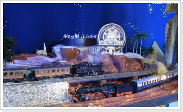 In den mehrgeschossigen, weitläufigen Theater-Foyers waren die phantastischen Welten des Ludwig II. in künstlerischer Abwandlung auch tagsüber präsentiert. Und dazu hatten die Künstler der sogenannten "Königswelten" auch eine Modelleisenbahn als Visionsträger eingesetzt! Die Proportionen der Ausgestaltungsdetails der neun Meter langen Anlage sind teilweise maßstäblich, teilweise aber bewusst verzerrt — ein künstlerisches Spiel mit Maßstäben und Akzenten! Dargestellt wurden in den sehr unterschiedlichen Anlagenbereichen Szenen aus dem Musical, in denen Ludwig II. von einer Weltumfahrung mit dem Heißluftballon träumt. Die "Rolle" des Ballons übernehmen hier nun fahrende Züge. Züge, die durch Landschaften Japans und der USA genauso fahren, wie durch Paris und Wien oder durch eine ägyptische Grabkammer und ein Bergwerk. Selbst der gute alte Mond wird von einem kleinen Zug umkreist.