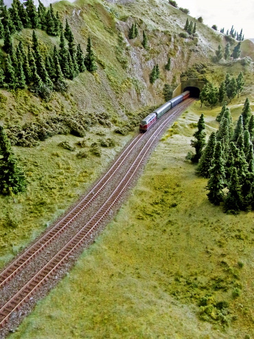 Weite Streckenführung mit einem kleinen Bahnhof über eine Schlucht hinweg.